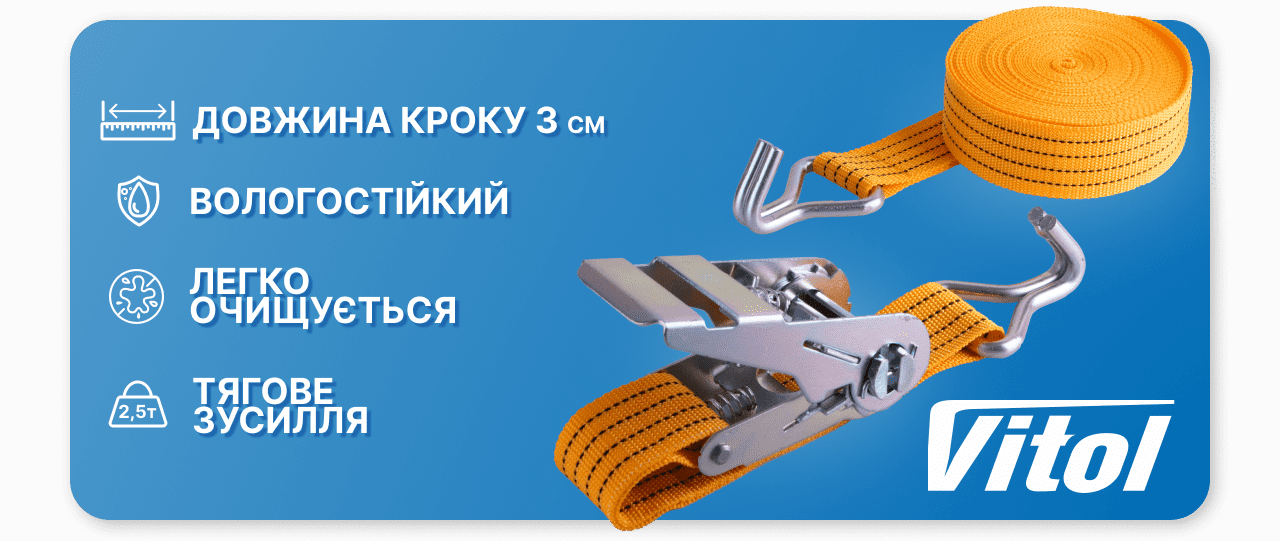 Завдяки своїм властивостям поліестерова стрічка, що використовується при виготовленні стяжних ременів, забезпечує необхідну притискну силу, зберігаючи при цьому цілісність поверхні та упаковки вантажу. Храпові механізми та гаки ТМ Вітол проходять ретельну перевірку на відповідність технічним вимогам, що гарантує виняткову якість та надійність всього комплекту. Завдяки простоті використання ремені мають значні переваги перед традиційними способами кріплення багажу.