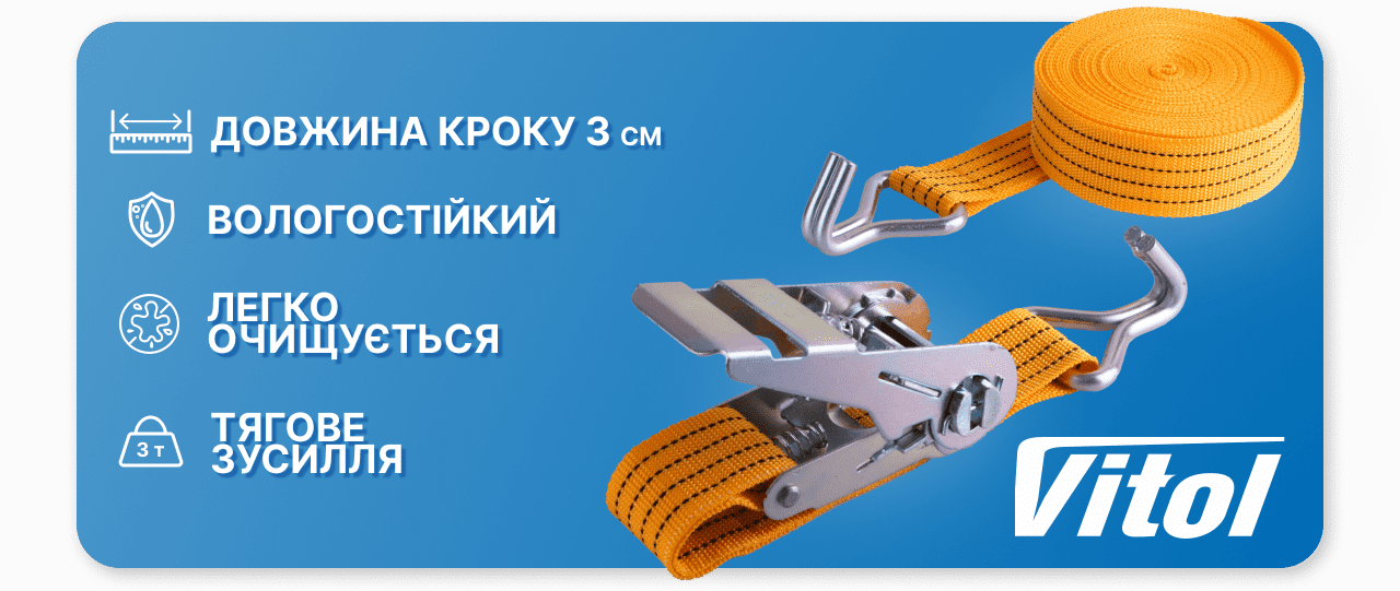 Завдяки своїм властивостям поліестерова стрічка, що використовується при виготовленні стяжних ременів, забезпечує необхідну притискну силу, зберігаючи при цьому цілісність поверхні та упаковки вантажу. Храпові механізми та гаки ТМ Вітол проходять ретельну перевірку на відповідність технічним вимогам, що гарантує виняткову якість та надійність всього комплекту. Завдяки простоті використання ремені мають значні переваги перед традиційними способами кріплення багажу.